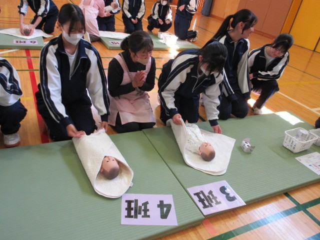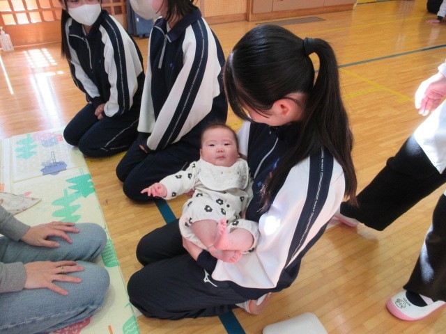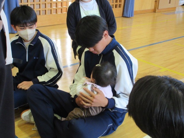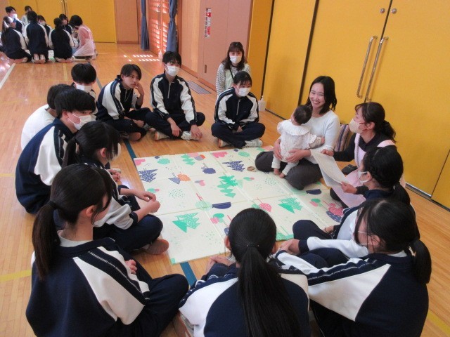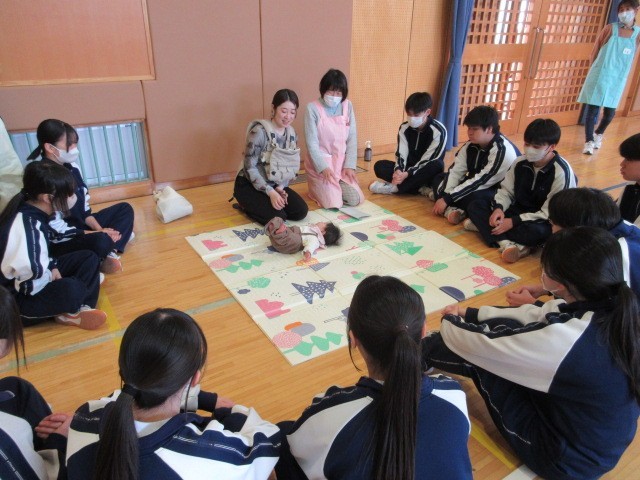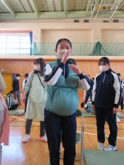 3月12日(木)に3年生がいのちの授業として、助産師の方や小さいお子さんのいらっしゃる親子に来校していただき、妊娠・出産の過程を学び、命の尊さについて考えました。また、妊娠体験や乳児人形抱っこ体験から、周りの人の心や体を大切に思う気持ちを考える時間となりました。