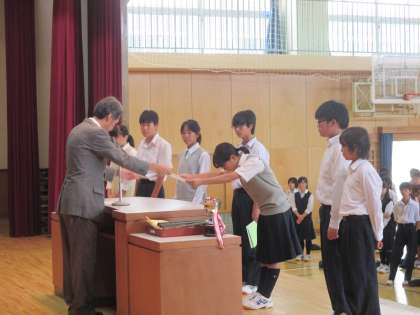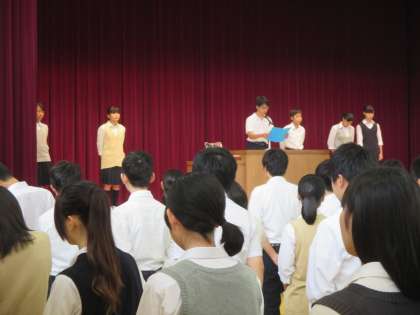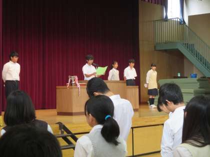 先日行われた生徒会役員選挙で決まった第70代のメンバーと第69代のメンバーで新旧の引き継ぎと認証式を行いました。69代のメンバーからこれからも続けてほしいことを伝えたり、70代のメンバーからは「二中をさらによくしていく」という所信表明演説が話されました。これからもよき伝統は引き継がれていくといいと思います。新役員のみなさんがんばってください!!