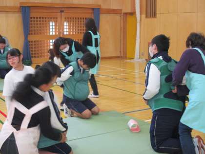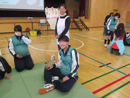 妊婦さんになった気分で妊婦ジャケット体験をしました。普段より、体は重くなり下も見えなく歩きずらそうでした。
