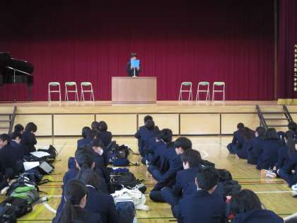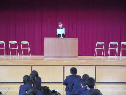 新2年生、新3年生の各代表が1年間の抱負を述べました。新2年生は1年生の時の反省からみんなで協力しあえる学年にしていきたい。新3年生は最高学年としての自覚と受験生として頑張っていかなければならないという抱負が述べられました。
