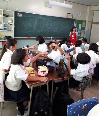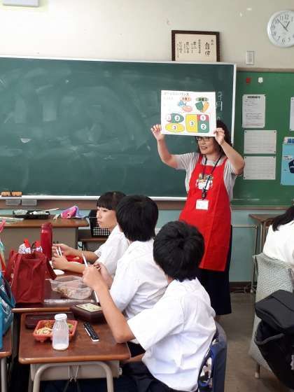昼食の時間に1年生2クラスで食育指導が行われました。