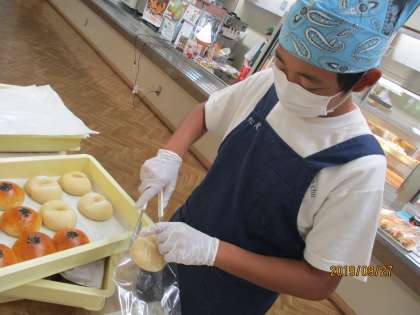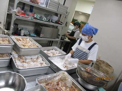 創価大学内のニュープリンス食堂さんでは、パンをビニール袋に入れる作業や唐揚げの仕込みなどをがんばりました。