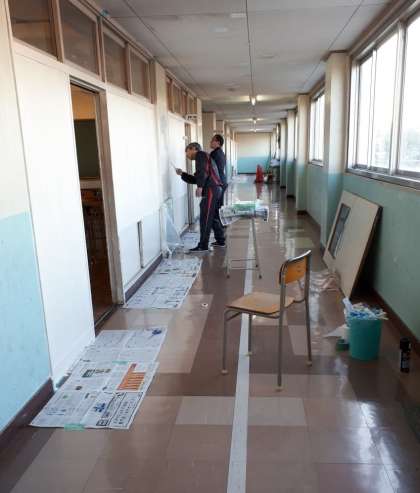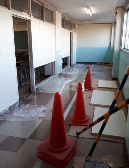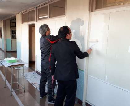 3年生の教室前の廊下の壁がペンキで白くきれいに塗り替えられています。昨日から用務さん、先生方ががんばってくださっています。