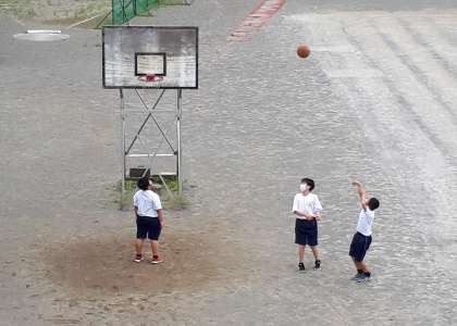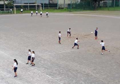 約40名が校庭に出て、ボールを使って遊んでいました。
