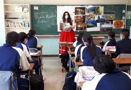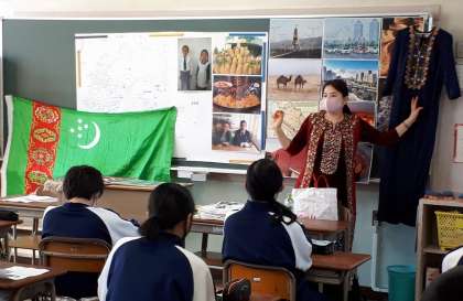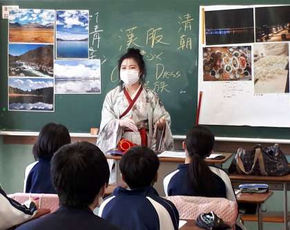 留学生の先生から各国の衣、食、住について詳しく説明していただきました。日本との違いに関心をもって、話を聞いたり、写真を見たりしていました。とても興味深い内容でした。