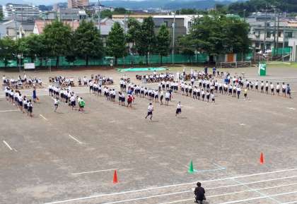 各クラスの代表がメディシンボールを頭の上、股の下を交互に通し、そのスピードをリレー形式で競いました。
