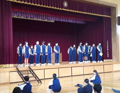 朝礼後には、バドミントン部と陸上競技部の表彰がありました。