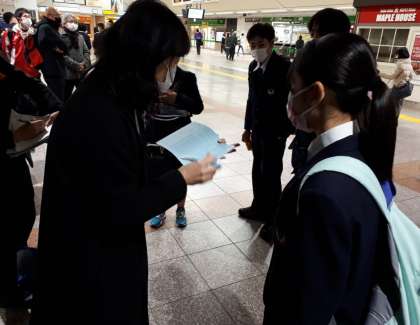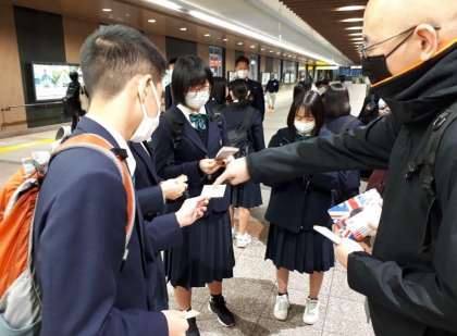1人ずつ検温、健康観察を行い、担当の先生から切符をもらいました。