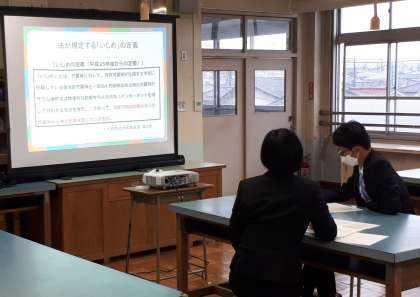 事例をもとにグループ討議等を行い、いじめの未然防止やいじめの対応について考えることができました。