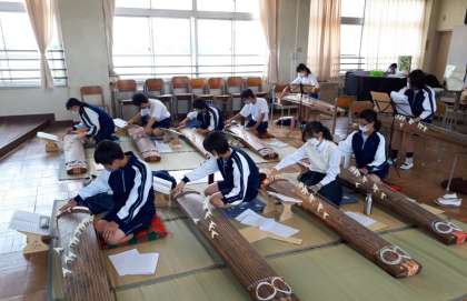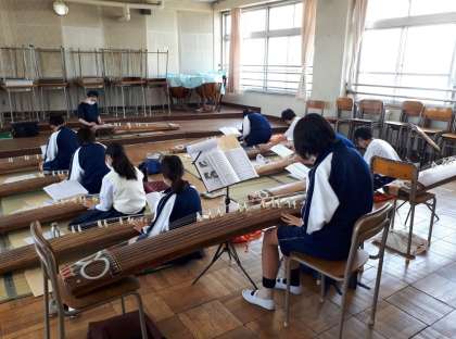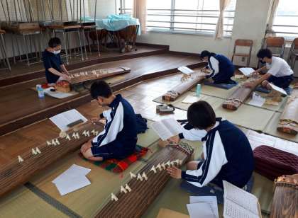 音楽の授業でも行っている「箏(こと)」を講師の先生から教えていただきました。
