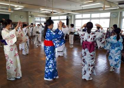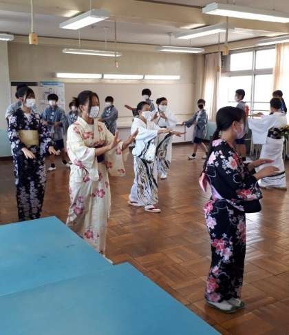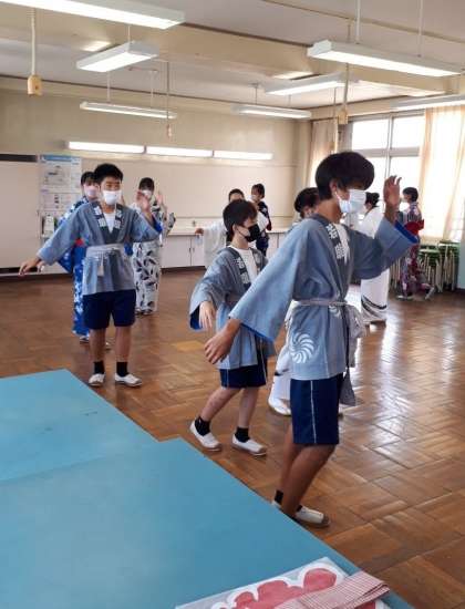 民謡踊りでは、浴衣やハッピを実際に着て踊りの練習を行いました。
