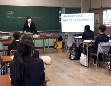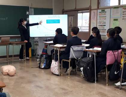 授業の後半には、人形を使って心肺蘇生法についても学びました。