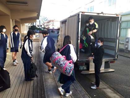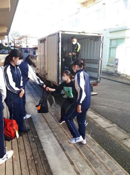 朝早く体育館に集合し、班ごとに忘れ物がないか荷物の確認を行いました。確認が終わった班から荷物をトラックに積み込みました。