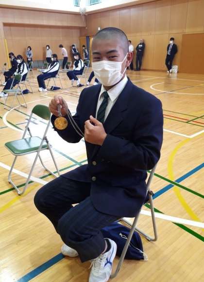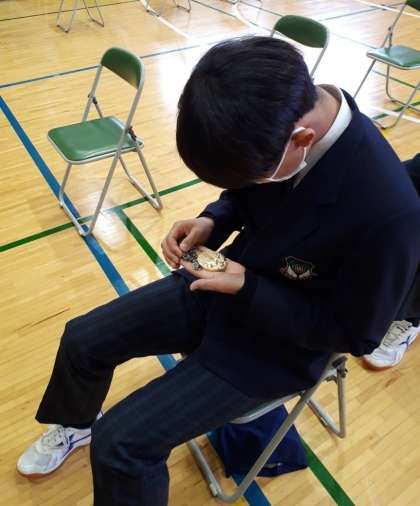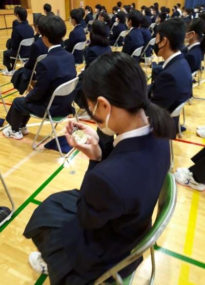 塚原さんは本物の金メダルを持ってきてくださり、何とその金メダルに生徒全員が触れさせていただきました。