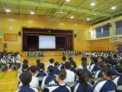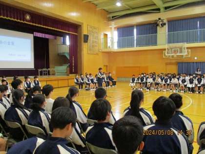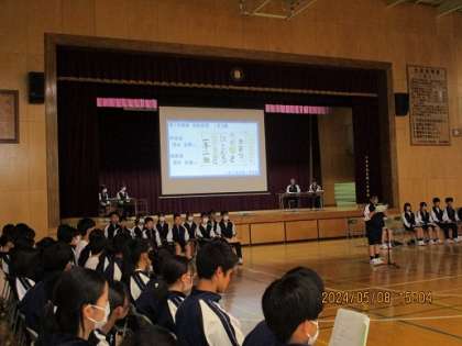 5月8日(木)生徒総会が行われました。静粛な雰囲気の中、総会が進行し、無事第1号〜第3号議案が承認されました。前期生徒会本部のスローガンは「OVER THE TOP〜限界を越えろ〜」です。より良い第二中学校を目指して、全校生徒一丸となって取り組みましょう!