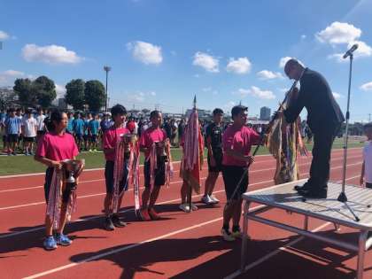 本日、本校陸上競技部が、富士森競技場で行われた連合陸上競技大会に参加しました。昨年度は、男子、女子そして男女総合優勝!開会式では、優勝旗返還。大会は、明日も行われます。今年も連覇を目指します!