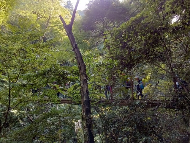 下りもインストラクターさんから、たくさんのお話を聞きながら歩きます。吊り橋ゆらゆらも、楽しそうです。