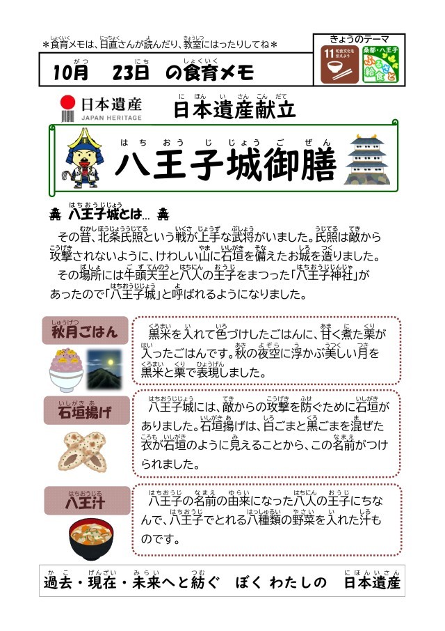 みそ汁は、八王子産の野菜を八種類使った「八王汁」。