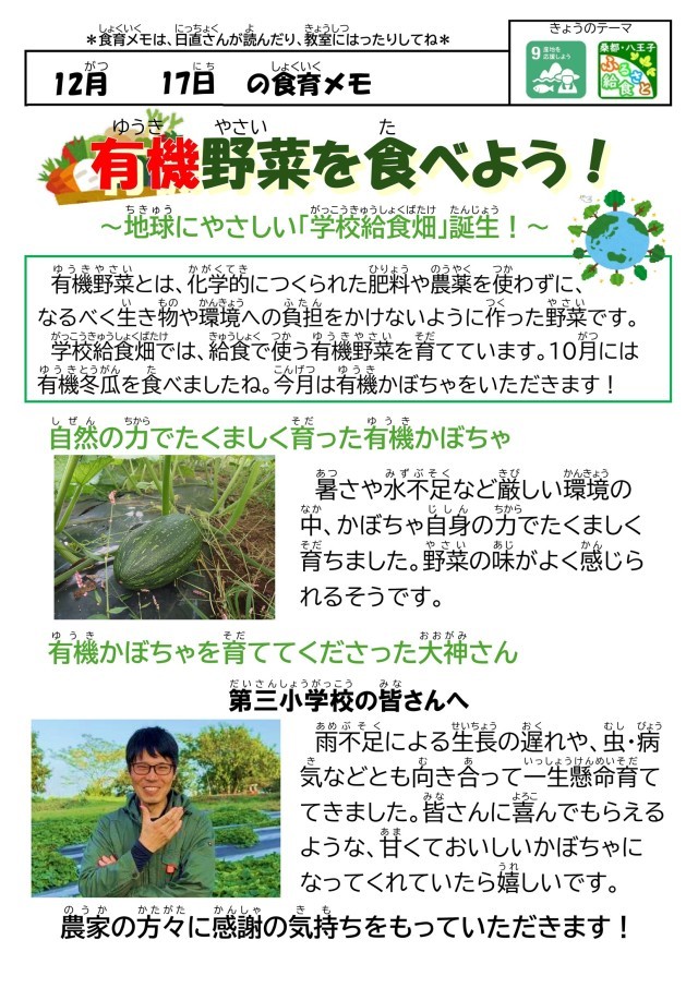 今日は、八王子の給食畑で育てられた有機野菜をいただきました。