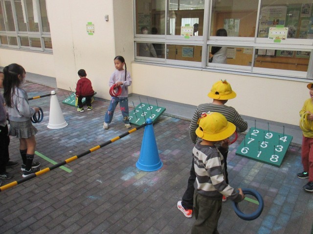 4つのゲームコーナー(玉入れ、島渡り、輪投げ、ボール運び)を作っていただき、子ども達は、そのゲームコーナーで楽しく遊ぶことができました。
