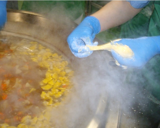 すいとんは、かぼちゃペーストを生地に練り込み、粘りが出るまでよくこねます。平たい形に成形しながら、そのまま汁の中に落としていきました。生地のとろみが汁に移るため、時間がたっても冷めにくく、最後まで温かい汁物になりました☺