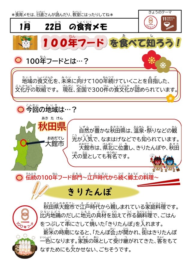 今日は、秋田県の「100年フード」に認定されている「きりたんぽ」をいただきました。