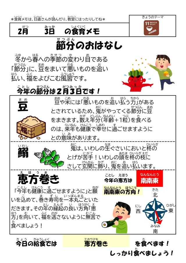 今日は節分ということで、給食では海苔にご飯を巻いて食べる恵方巻をいただきました!