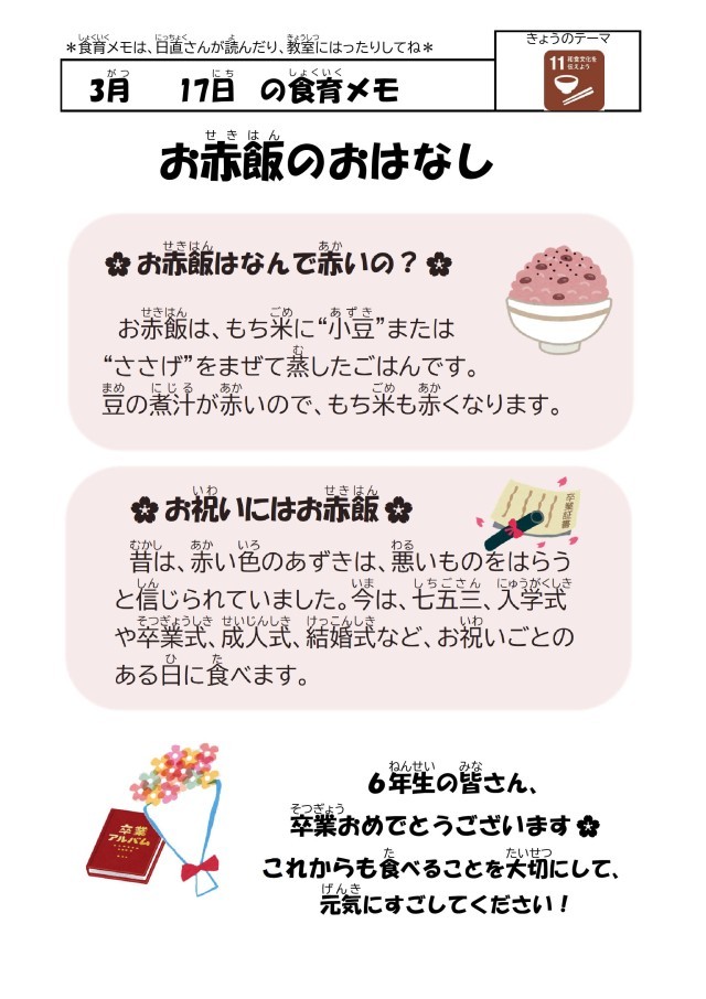 豆の入ったごはんや魚料理は苦手な子もいますが、クラスを回りながら子どもたちと話していると「お赤飯もっと食べたいです!」「この魚味つけ最高です」と声をかけてくれる子も多かったです。今日のお赤飯に使ったささげは、「備中だるまささげ」という粒が大きくて噛むと豆の味わいが深いとても美味しいものです。また、ぶりの照り焼きは「照り」がでるように工夫して作りました☺