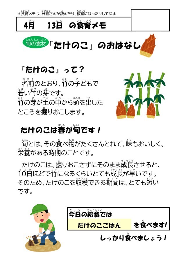 今日は、今が旬の「たけのこ」、「のらぼう菜」を使った献立でした!