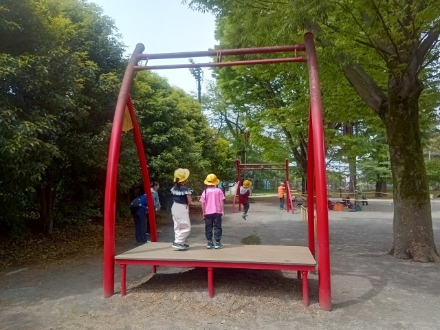 クラスごとに分かれて活動します。こちらは遊具遊びです。少し雨が残っていましたが、ちゃんと拭いたら遊べました!