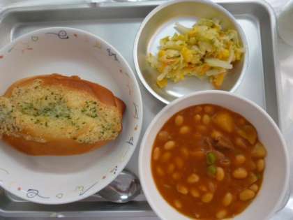給食室からこんにちは!今日の献立は、ガーリックフランス・牛乳・ポークビーンズ・コールスローサラダです。