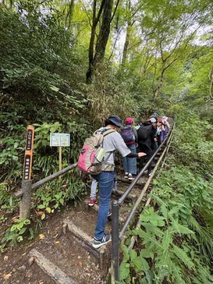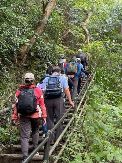 いきなりの急階段に「うわ〜っ!」の声。頑張って登りますよ!