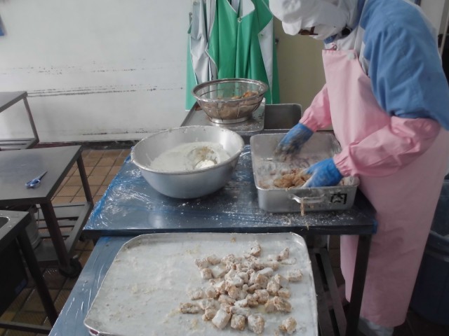 「今日は白身魚のから揚げです。角切りにした白身魚に、にんにく生姜としょうゆとごま油で下味をして、片栗粉をまぶして揚げていきます。お魚が苦手な子どもも食べやすい調理法です。」