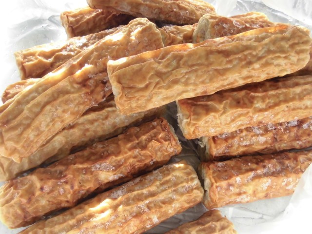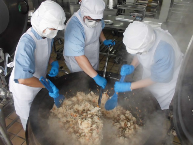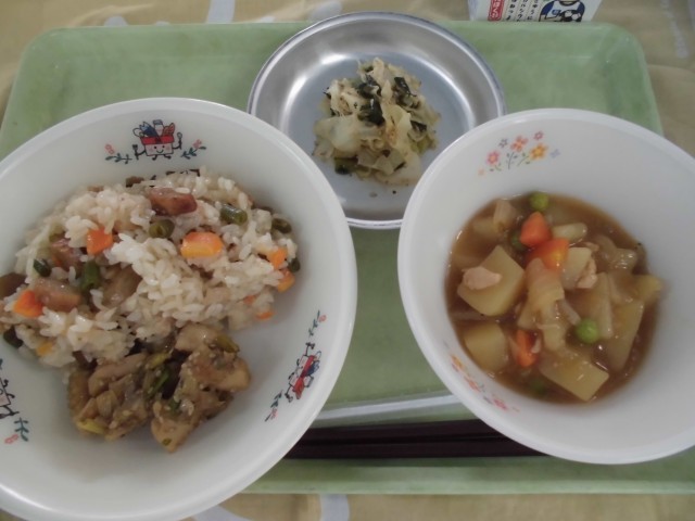 「今日は100年フード献立です。鳥取県の郷土料理をいただきます。鳥取県から取り寄せた「とびうお」のすり身で作られた「あごちくわ」を使って大山おこわを作りました。大山おこわは、大山山麓地域の伝統食の一つです。給食では鶏肉、ごぼう、あごちくわ、しいたけ、油揚げの具を調味料で炒め、炊き立てのご飯に混ぜていただきました。お祝い事などで、よく食べられるそうです。」