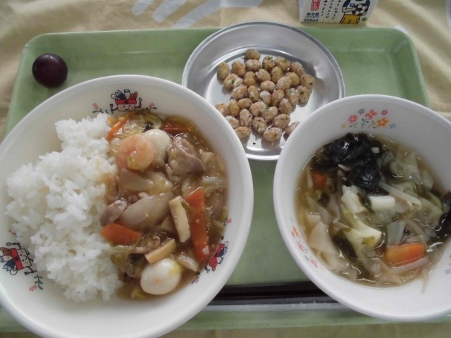 「今日はみんなが大好きなポップビーンズです。茹でた大豆に片栗粉をまぶし油で揚げ、塩と青のりをまぶします。大豆はたんぱく質や食物繊維を多く含み、子どもたちにもたくさん食べてほしい食材です。」