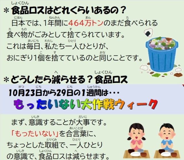 「10月は食品ロス削減月間です。第四小学校のもったいない大作戦でスでどうしたら食べ残しが減るのかを考えってもらいました。みんなが意識することで食品ロスをを減らすことができます。」