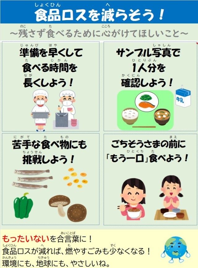 「もったいない大作戦二日目です。給食の準備もみんなで協力しながら行っています。一人分をしっかり確認し食品ロスや自分の健康についても考えてほしいと思います。」