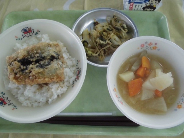 「今日は今が旬の食材【さんま】をかば焼き丼にしていただきます。給食ではさんまを油で揚げて、甘辛いたれをかけます。夏から秋にかけて、いちばん脂ものっておいしい季節です。」