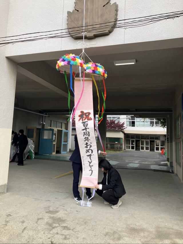 風船が舞う中、くす玉が割れ、「おめでとう!」
