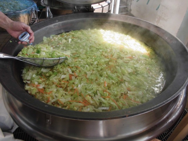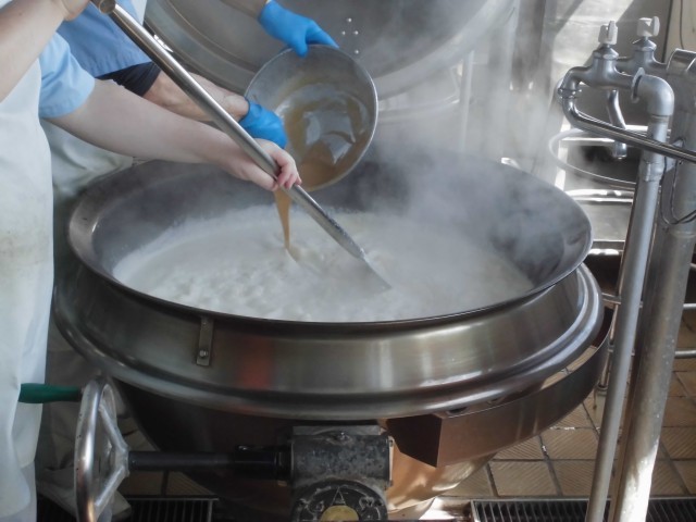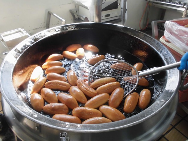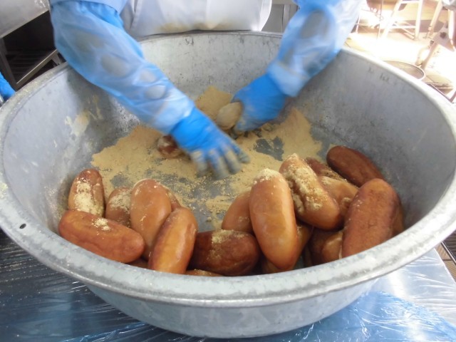 写真3枚目:揚げたパンにきなこをまぶしているところ