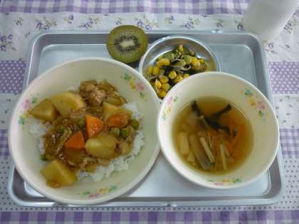 【献立】 チキンカレー きのこのスープ わかめサラダ 牛乳