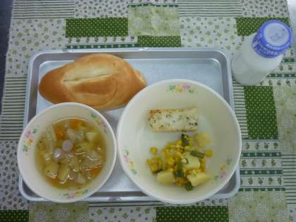 【献立】ソフトフランスパン イカのハーブ焼き じゃがコーンソテー