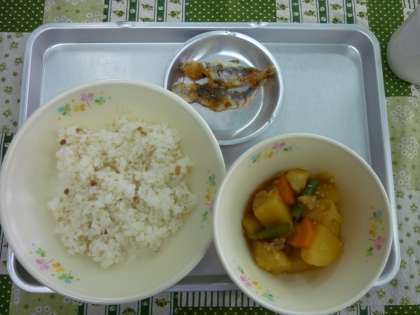 ごまナッツご飯 豆あじの南蛮漬け 韓国風肉じゃが 牛乳
