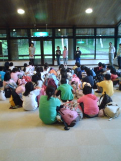 宿に着きました。午前中は車に酔っていた子もいましたが、もうみんな大丈夫です。雨が降ってきたので、室内で開校式になりました。
