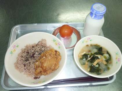 <開校記念日献立>おせきはん、とりにくのから揚げ、なめこ味噌汁、牛乳、くだもの