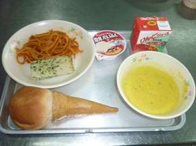 いかのハーブやき、スパゲティーナポリタン、かぼちゃのポタージュ、おたのしみデザート(雪見大福)、アイスクリームパン、ジュース