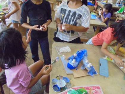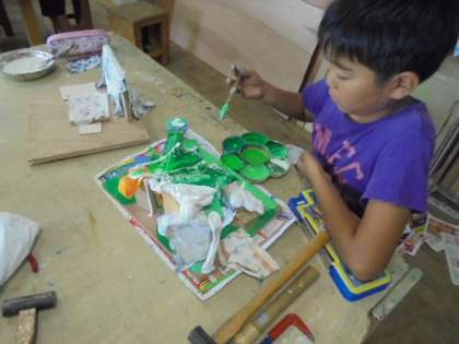 先日の図工の時間では、4年生が木と布を使って「色の世界」を作りました。