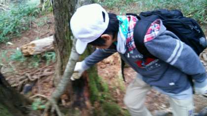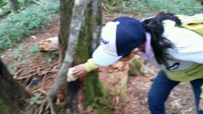 とても硬いさるのこしかけに触れています。