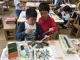 ブラシで絵の具を飛ばしたり、水でにじませたり、ストローで吹いたり いろいろな技を学んで、子供たちは楽しそうに使っていました。
