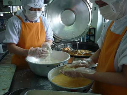今日の2枚目の写真は、給食室でひとつひとつ丁寧に作っているところです。